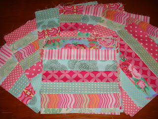 Our lounge features the one thing that ever got renovated. (We bought our house because very little had been changed.) The previous owners had removed the original Victorian fireplace and replaced it with a 1930's bungalow style glazed brick number. The terracota colour of the brick is so strong and tends to dictate any colour scheme we choose for that room. So when we were visiting Mt Tamborine, QLD back in April I found these beautiful fat quarters of Wyndham fabrics that are supposed reproductions of Civil War prints (hey, I bought it!) in shades of dark pink, terracotta and brown, I had to have them. I've co-ordinated them with some Denyse Schmidt Country Fair and eventually had enough to make a reasonable sized quilt. Then comes the dilema of what to do with them! I've really enjoyed the construction of the Old Red Barn Co's quilt along quilt so I've decided to do something similar for the 'lounge quilt'. Because I've got fat quarters, I can't go full width which means my blocks can't be as deep so I'll join 5 strips of the 2 1/2" strips instead of the 6 and cut them into smaller 10 1/2" blocks.